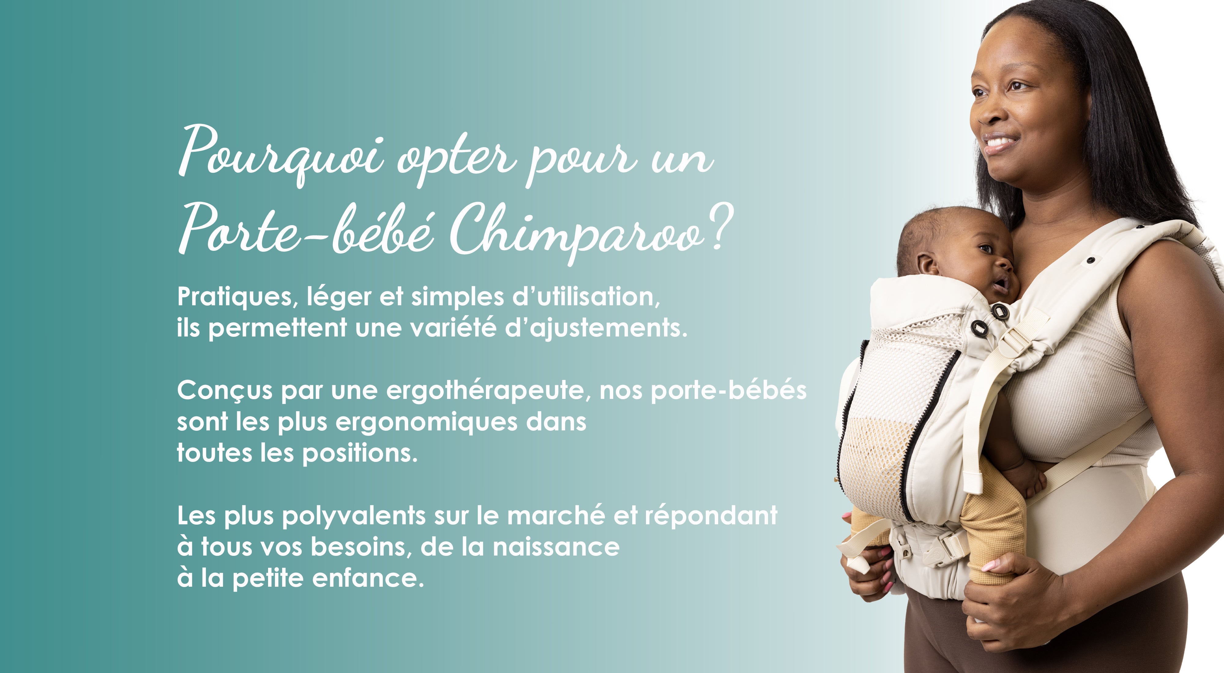 Depuis 2007, Chimparoo est à la pointe du portage au Québec et à l'international. Fondée par Christine Duhaime, diplômée en ergothérapie et passionnée de design textile, notre entreprise s'engage à offrir des porte-bébés ergonomiques et innovants, conçus pour soutenir le développement optimal de votre bébé. Chaque produit est le fruit de notre passion pour le bien-être des familles, alliant qualité, sécurité et expertise. Faites confiance à Chimparoo, les experts en portage, pour renforcer votre lien avec votre enfant tout en vous offrant liberté et confort.