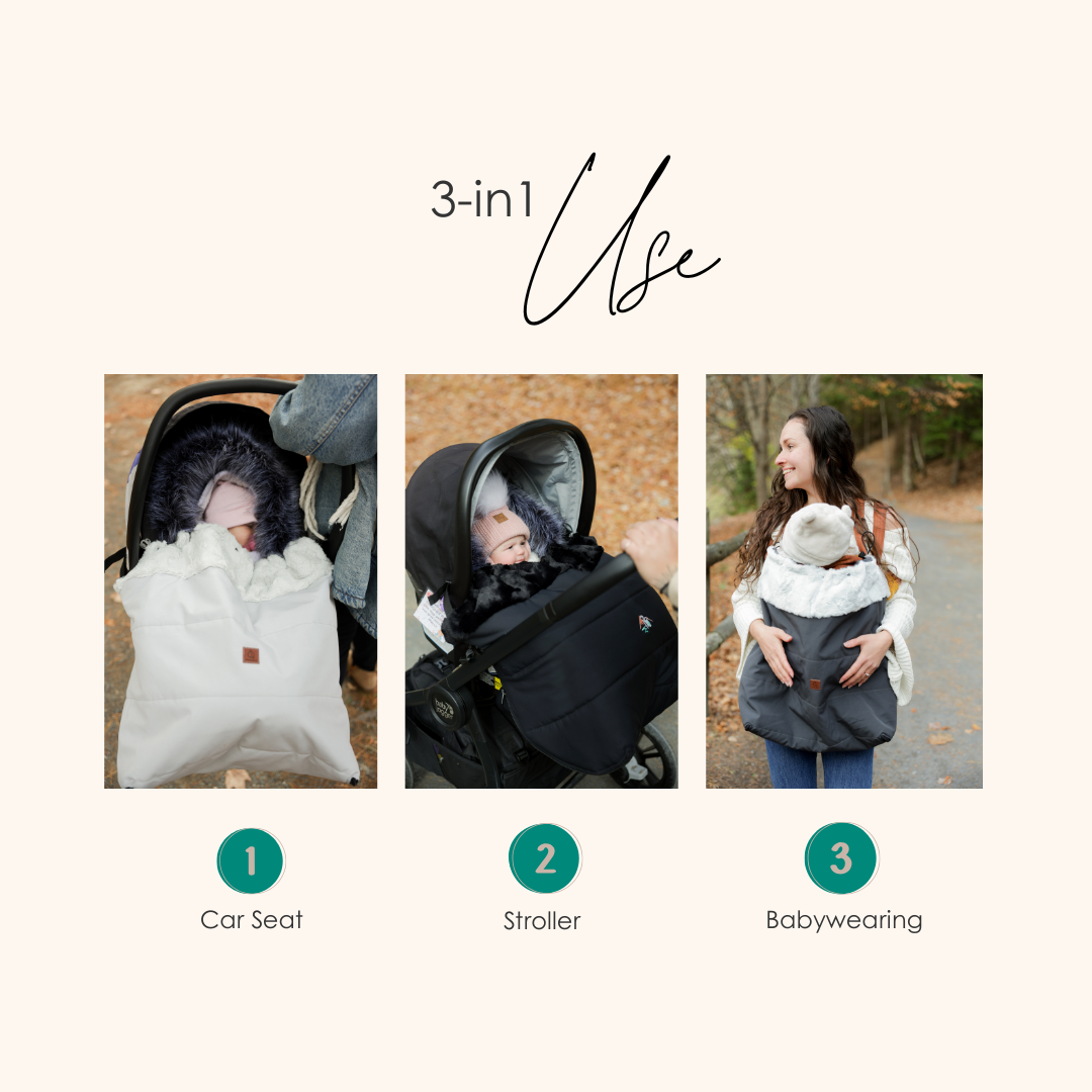A premium protective cover designed to adapt perfectly to all baby gear — carrier, car seat, or stroller — while ensuring unmatched comfort and protection for your little one.