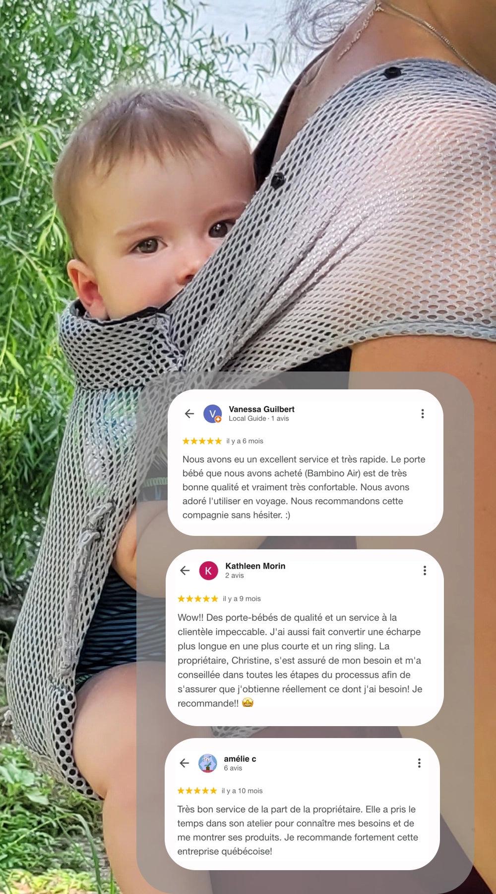 Christine s'est fixée comme objectifs d'offrir des produits novateurs et de qualité, tout en sensibilisant les parents aux bienfaits du portage. C'est avec cette vocation qu'elle continue de vous servir depuis plus de 17 ans!